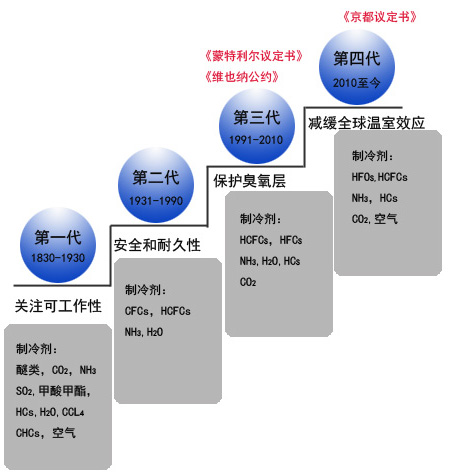 制冷技術(shù)的歷史實際是制冷劑發(fā)展過程的歷史。早期人們利用儲存天然冰、水的蒸發(fā)效應(yīng)及其他一些方法來制冷,19世紀(jì)30年代,Perkins發(fā)明了蒸氣壓縮式制冷循環(huán)后,人類迎來了制冷技術(shù)的發(fā)展期,而制冷劑的發(fā)明、更新和替換始終貫穿整個過程。目前根據(jù)新時期的發(fā)展要求,制冷劑又將面臨新的挑戰(zhàn)。目前人們將制冷劑的發(fā)展分為4個階段,各階段的特征如左圖所示。